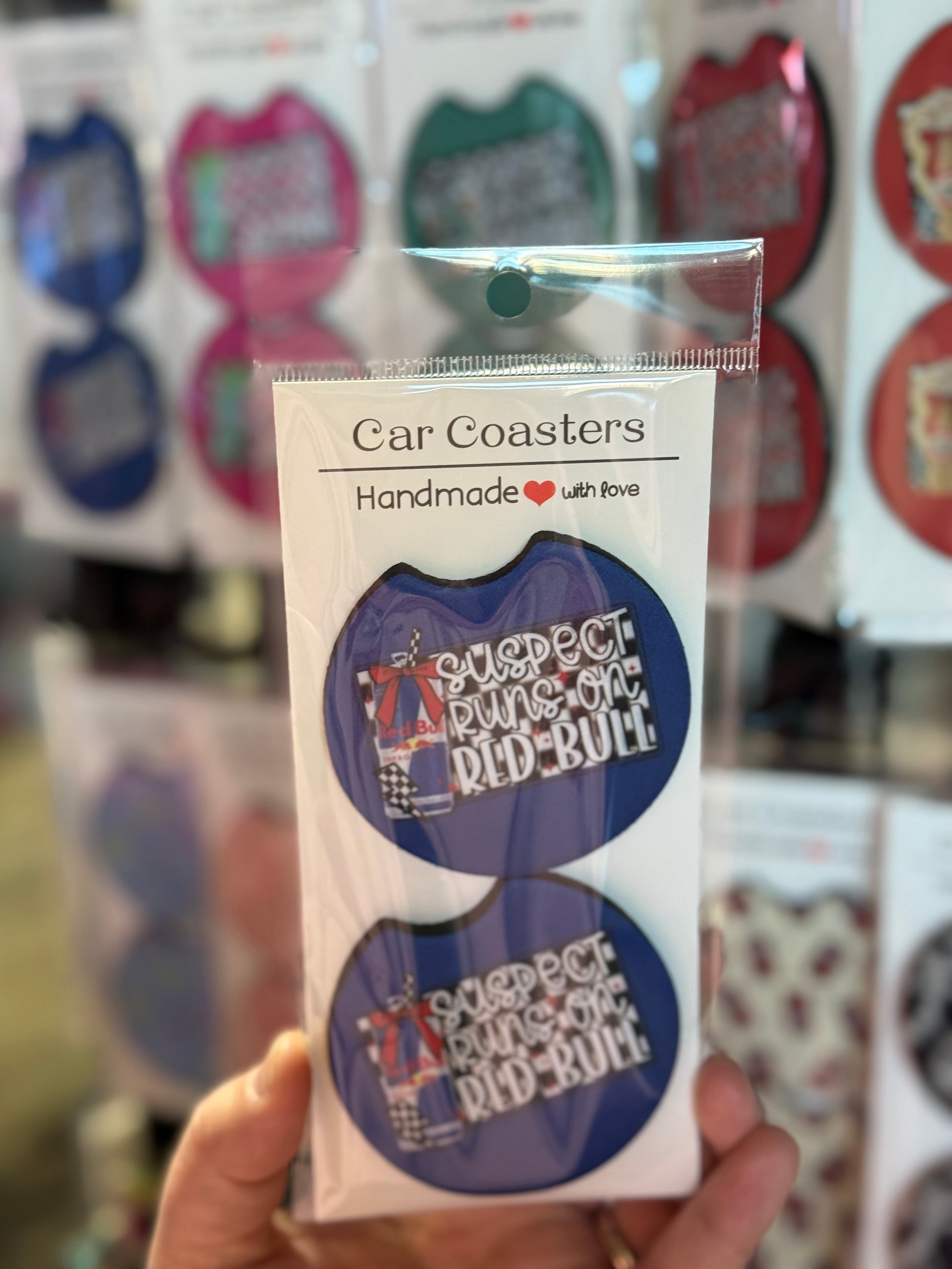 Neoprene Car Coaster Set of 2. 2.75 inches wide. Mild soap, cold water, and air dry to clean.